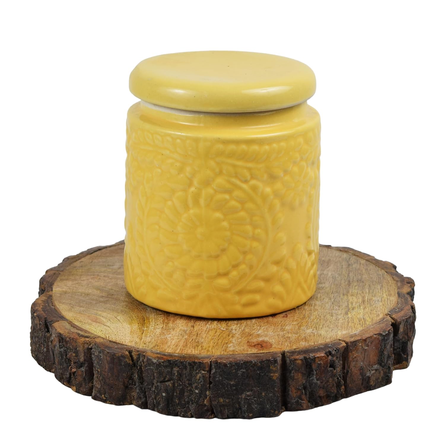 DESCRIPTION: PACK CONTENT: 1 storage jar with lid MATERIAL: Ceramic and wood FINISH: Ceramic jar airtight lid CAPACITY: 1/2 litre WEIGHT: 500 gm CARE INSTRUCTIONS: Clean with damp cotton cloth. Do not use scrub Microwave Safe- No Dishwasher Safe- No DISCLAIMER: This product is handmade and each piece is unique. The product is of crackled texture, kindly don’t mistake it for cracks on the product. |